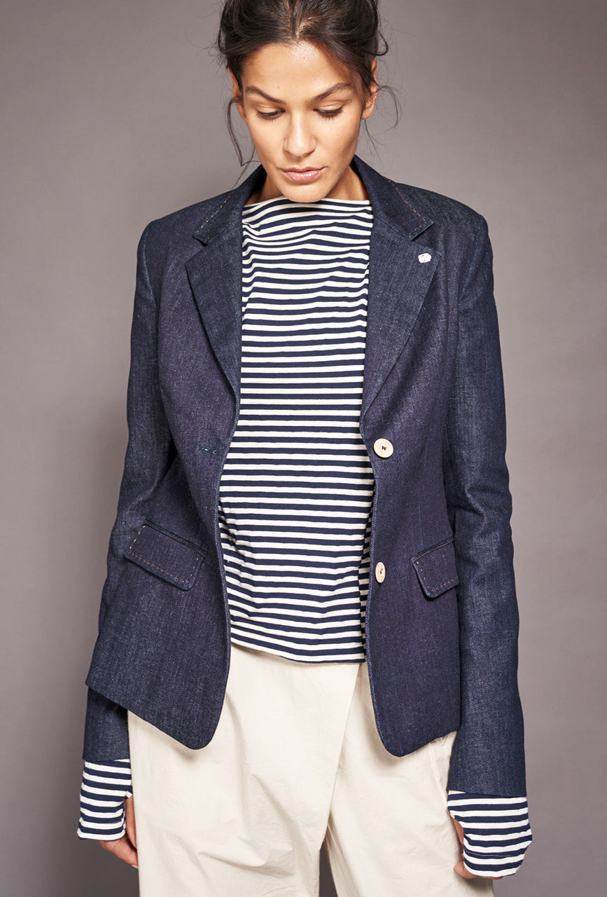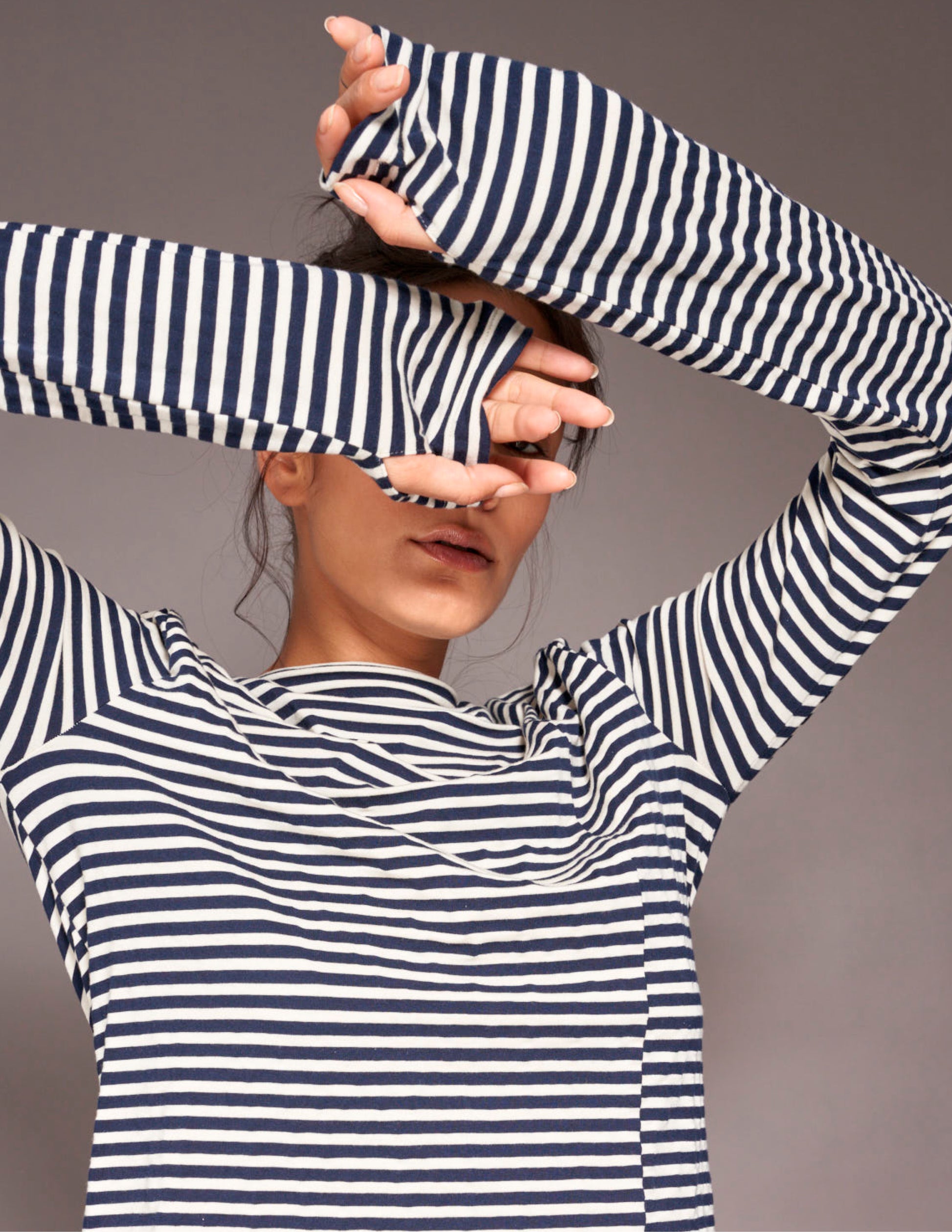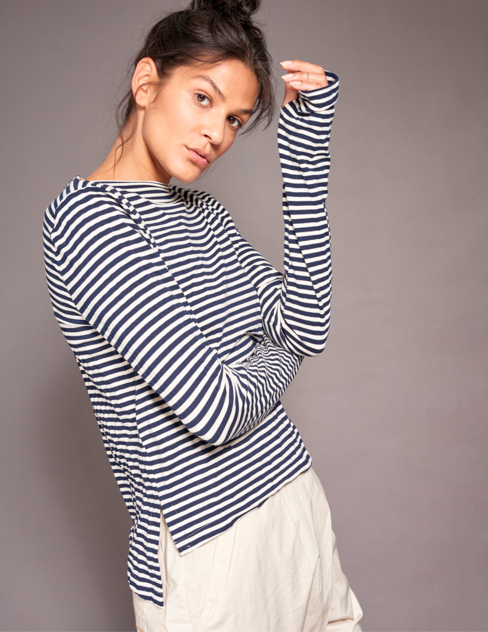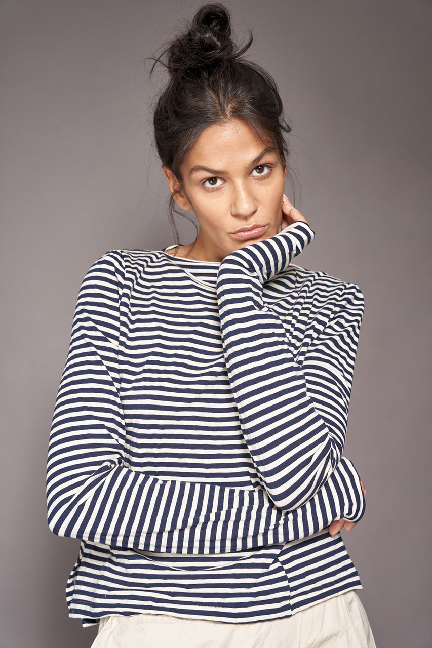The super soft and silky fabric feels like a dream against your skin, with extra long sleeves and a special cut for a beautiful fit, in a classic white/blue stripe. The Italian jersey is a mix of organic cotton, Lyocell and SeaCell - a fiber based on Seaweed.